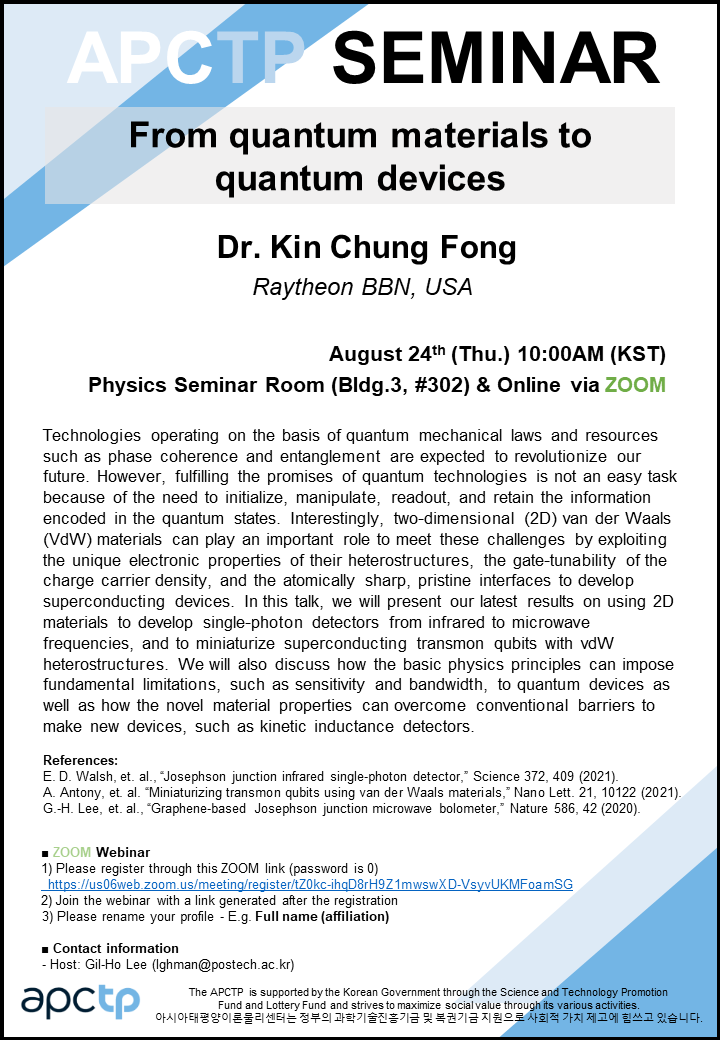 | Place | Physics Seminar Room (Bldg.3, #302) & Online via ZOOM | ||||||