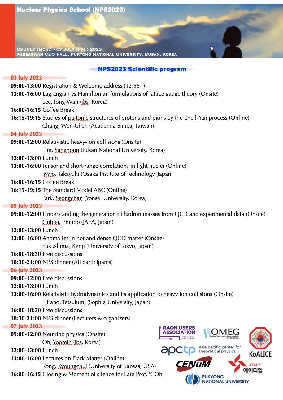 [Topics] High-Energy Experiment Neutrino Experiment Extreme QCD Chiral Theory Relativistic heavy-ion collision Lattice QCD Nuclear Theory Standard Model RAON Experiment Dark matter Program Schedule [03 July 2023] 09:00-13:00 Registration & Welcome address (12:55~) 13:00-16:00 Lagrangian vs Hamiltonian formulations of lattice gauge theory (Onsite) l Lee, Jong-Wan (ibs, Korea) 16:00-16:15 Coffee Break 16:15-19:15 Studies of partonic structures of protons and pions by the Drell-Yan process (Online) l Chang, Wen-Chen (Academia Sinica, Taiwan) [04 July 2023] 09:00-12:00 Relativistic heavy-ion collisions (Onsite) l Lim, Sanghoon (Pusan National University, Korea) 12:00-13:00 Lunch 13:00-16:00 Tensor and short-range correlations in light nuclei (Online) l Myo, Takayuki (Osaka Institute of Technology, Japan) 16:00-16:15 Coffee Break 16:15-19:15 The Standard Model ABC (Online) l Park, Seongchan (Yonsei University, Korea) [05 July 2023] 09:00-12:00 Understanding the generation of hadron masses from QCD and experimental data (Onsite) l Gubler, Philipp (JAEA, Japan) 12:00-13:00 Lunch 13:00-16:00 Anomalies in hot and dense QCD matter (Onsite) l Fukushima, Kenji (University of Tokyo, Japan) 16:00-18:30 Free discussions 18:30-21:00 NPS dinner (All participants) [06 July 2023] 09:00-12:00 Free discussions 12:00-13:00 Lunch 13:00-16:00 Relativistic hydrodynamics and its application to heavy ion collisions (Onsite) l Hirano, Tetsufumi (Sophia University, Japan) 16:00-18:30 Free discussions 18:30-21:00 NPS dinner (Lecturers & organizers) [07 July 2023] 09:00-12:00 Neutrino physics (Onsite) l Oh, Yoomin (ibs. Korea) 12:00-13:00 Lunch 13:00-16:00 Lectures on Dark Matter (Online) l Kong, Kyoungchul (University of Kansas, USA) 16:00-16:15 Closing & Moment of silence for Late Prof. Y. Oh |