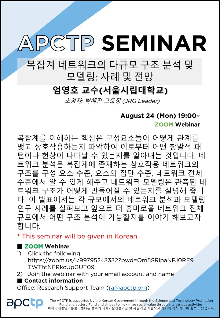 | Title | [JRG] 복잡계 네트워크의 다규모 구조 분석 및 모델링: 사례 및 전망 | ||||||